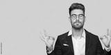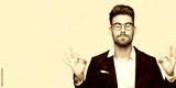 Young handsome business man wearing glasses relax and smiling with eyes closed doing meditation gesture with fingers. Yoga concept.