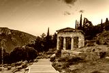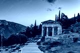 Sunset view of Athenian treasury at the ancient delphi site in Greece
