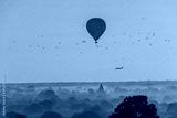Balloon over Bagan, landing airplane and the skyline of its temples, Myanmar
