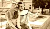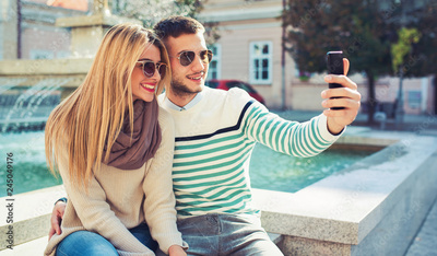 Happy couple making a selfie with mobile phone. Dating, love, relationships, lifestyle concept