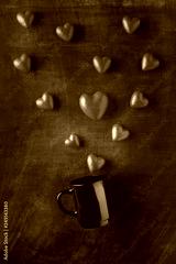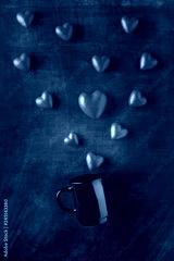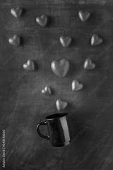 Heart shaped candies and black cup.
