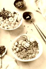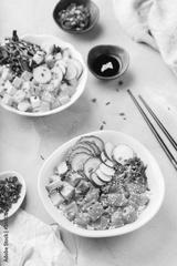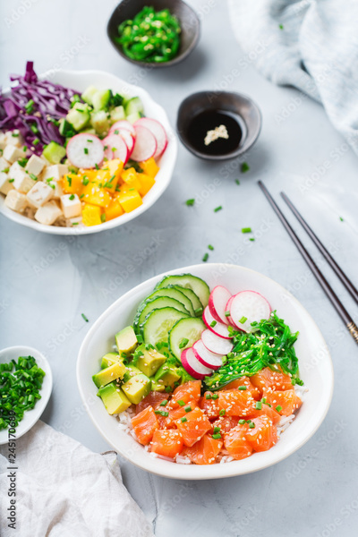 Fresh hawaiian salmon and tofu poke bowl for healthy lunch