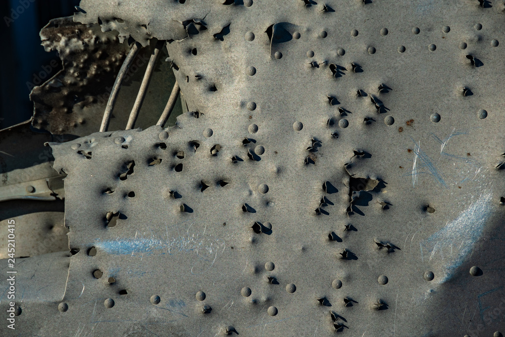 Close up photo of bullet marks on the Abandoned DC Plane's fuselage on Solheimasandur, Iceland