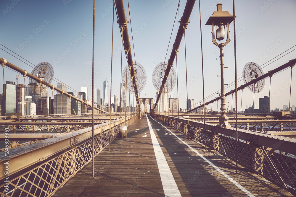 Wide angle view of the Brooklyn Bridge at sunrise, color toned picture, NYC.