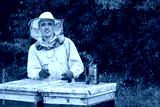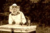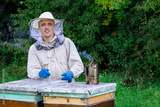 Portrait of a beekeeper in an apiary near a hive in a protective suit. Beekeeping concept. Beekeeper harvesting honey.