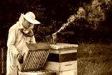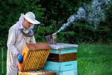 Beekeeper on apiary. Beekeeper is working with bees and beehives on the apiary. Apiculture concept.