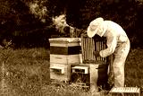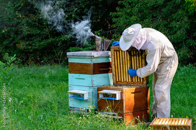 Beekeeper on apiary. Beekeeper is working with bees and beehives on the apiary. Apiculture concept.