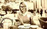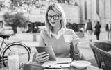 Business woman on coffee break in a cafe. Business, education, lifestyle concept