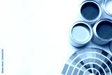 Different paint cans and color palette on white background, top view. Space for text