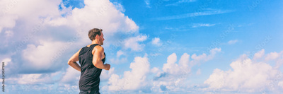 Run fit young man athlete runner jogging exercise cardio on blue sky background banner panorama. Healthy active living.