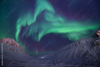 The polar arctic Northern lights aurora borealis sky star in Norway travel Svalbard in Longyearbyen city the moon mountains