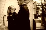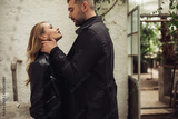 Young handsome man in total black clothes holding hand on neck of pretty woman dreamily looking at each other while spending time together in old cozy greenhouse