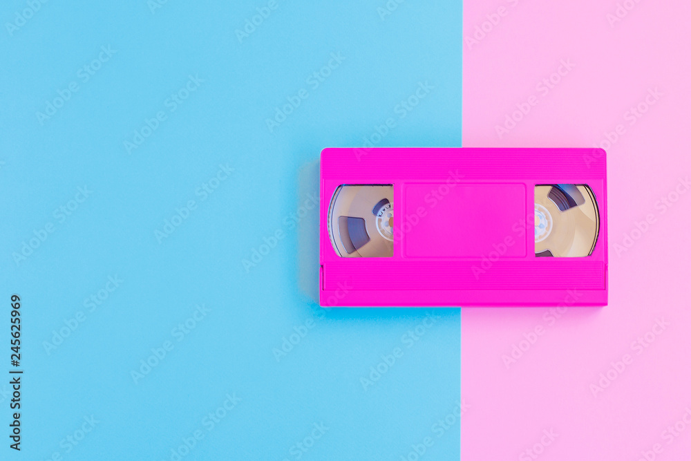 VHS cassette on soft pink and blue paper background. Minimal concept. Creative concept. Cinema concept. Pop Art. Bright Sweet fashion Style.
