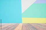 empty wood desk and abstract creative colorful pastel paper for background. blank space for text and images.