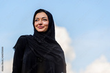 Beautiful middle eastern woman filling joy in the cloudy sky packground.