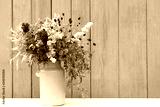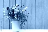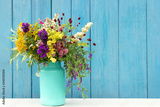 Bouquet of wild flowers in starm tin can vase on background blue wooden boards. Template for postcard Copy space lettering text or design Concept Women's day, Mothers Day, Hello summer or Hello spring