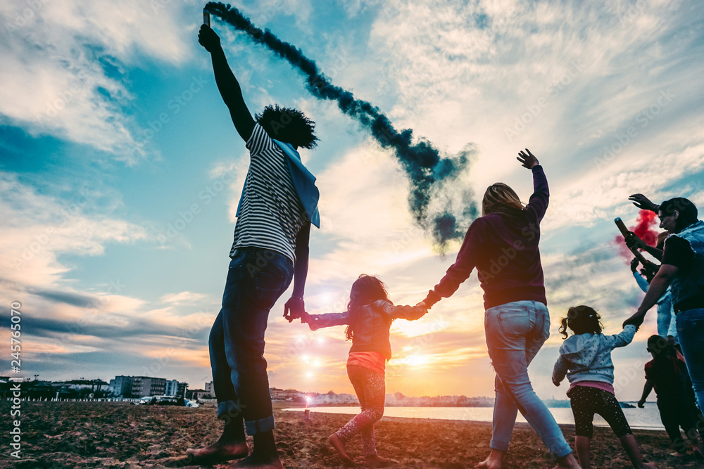 Family friends having fun with fireworks at sunset on the beach - Adult people having fun with their children for holidays event outdoor - Focus on left man body - Love, carnival and fest concept