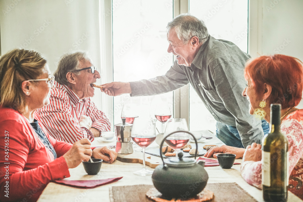 Group of senior people drinking italian style moka coffee and tea after lunch
