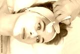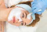 Relaxed young woman is getting facial skin care treatment at beauty salon. Beautician is touching brush with clay to face girl