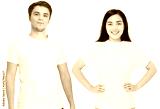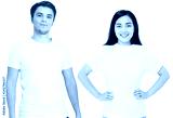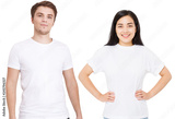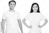 Asian girl and man in blank template t shirt isolated on white background. Guy and young woman in tshirt with copy space and mock up for advertising. White shirts. Front view