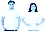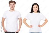 Asian girl and man in blank template t shirt isolated on white background. Guy and young woman in tshirt with copy space and mock up for advertising. White shirts. Front view