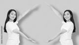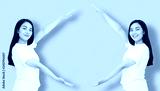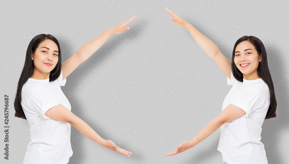 Japanese girl showing copy space by hands. Young asian woman isolated on gray background. Collage Advertising hand concept. Korean beauty