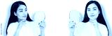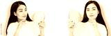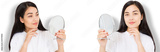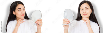 Collage of asian woman looking in mirror. Macro japanese female face isolated on white background. Skin care and beauty spa concept. Anti aging and collagen. Copy space