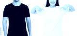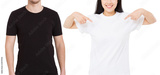 Asian girl and man in blank template t shirt isolated on white background. Guy and young woman in tshirt with copy space and mock up for advertising. White and black shirts. Front view. Cropped image
