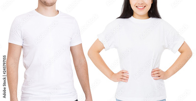 Asian girl and man in blank template t shirt isolated on white background. Guy and young woman in tshirt with copy space and mock up for advertising. White shirts. Front view
