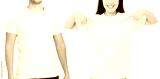 Asian girl and man in blank template t shirt isolated on white background. Guy and young woman in tshirt with copy space and mock up for advertising. White shirts. Front view