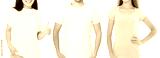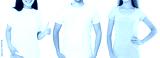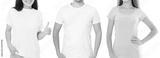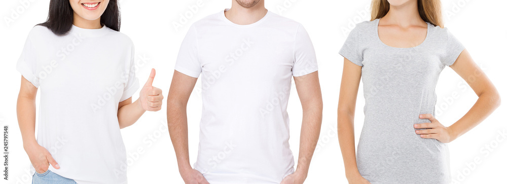 Women and man in blank template t shirt isolated on white background. Guy and girls in tshirt with copy space and mock up for advertising. Black and gray shirts. Front view