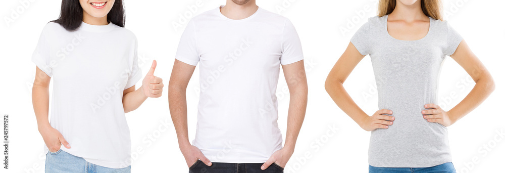 Women and man in blank template t shirt isolated on white background. Guy and girls in tshirt with copy space and mock up for advertising. Black and gray shirts. Front view