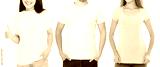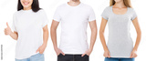 Women and man in blank template t shirt isolated on white background. Guy and girls in tshirt with copy space and mock up for advertising. Black and gray shirts. Front view