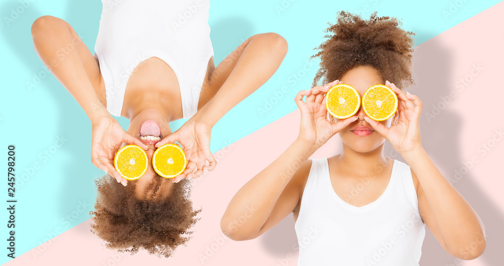 Summer time holidays. Beautiful young african american women with orange fruit food collage isolated . Afro girl and diet concept. Copy space. Mock up. Skin care, Afro curly hair style