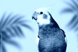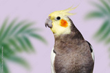 Adult male pretty cockatiel on pink background with tropical leaves. Cute parrot