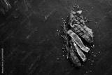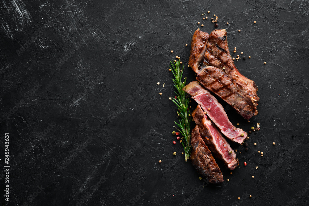 Veal steak on a bone on a black background. Free space for your text. Top view.