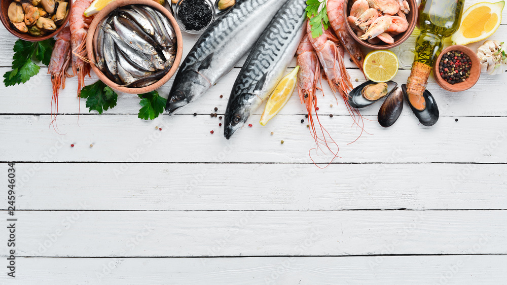 Seafood on a white wooden background. Fresh fish, shrimp, oysters and caviar. Top view. Free copy space.