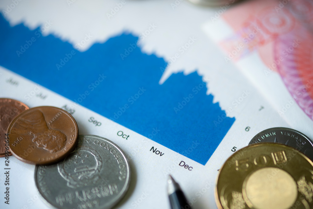 US dollar and Yuan coins on business investment blue graph. Value investor concept.-Image.