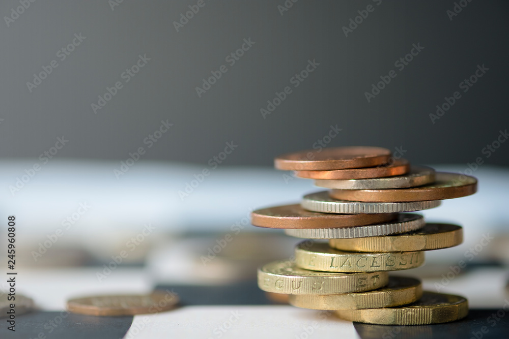 Pound sterling coins stacking on chess table with black background.Currency exchange concept.-Image.