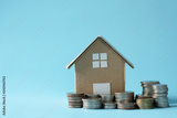 House model around with stacking coins money on blue background. Saving and investment to real estate concept. -image.