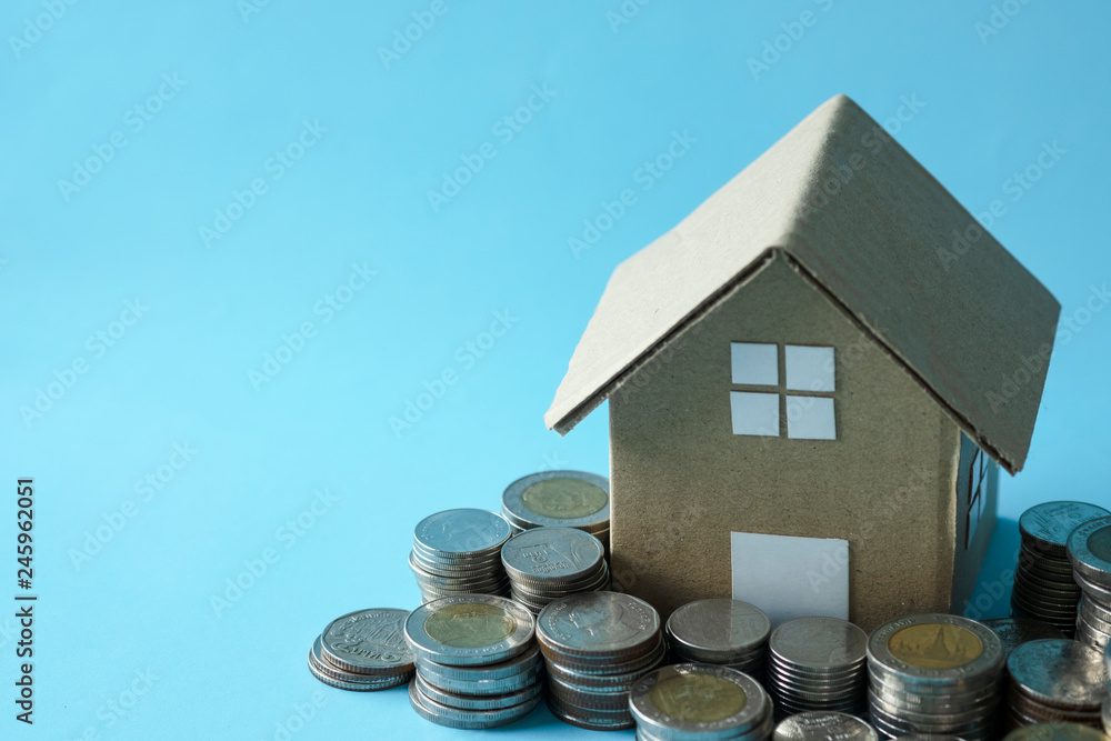 House model around with stacking coins money on blue background. Saving and investment to real estate concept. -image.