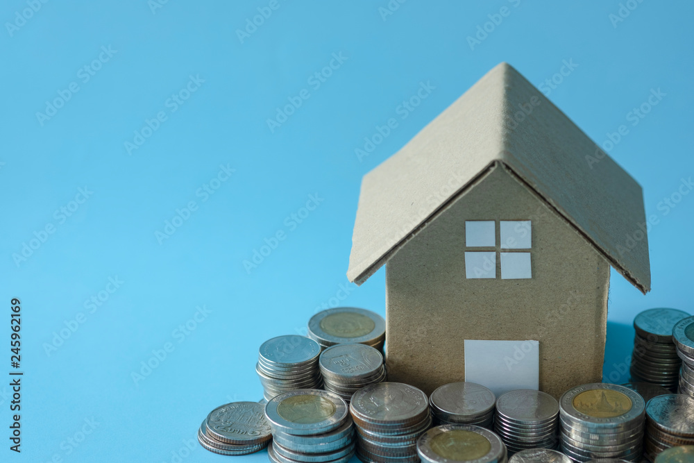 House model around with stacking coins money on blue background. Saving and investment to real estate concept. -image.
