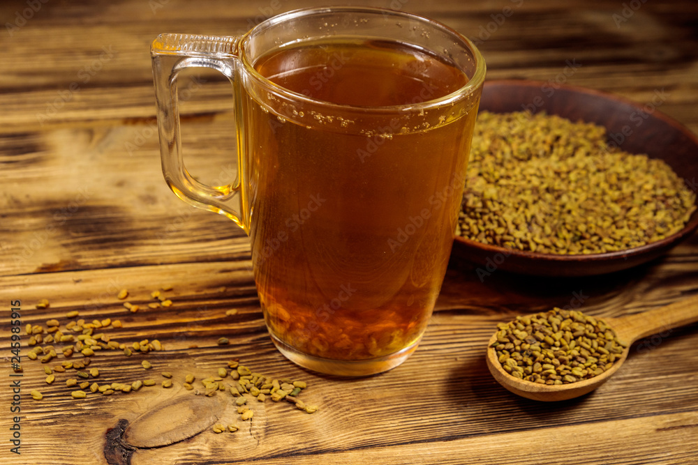 Egyptian yellow tea or Methi Dana drink and fenugreek seeds on wooden table
