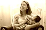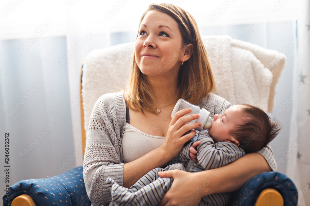 Portrait of a pretty mother feeding her newborn baby from a bottle while relaxing at home