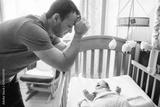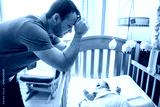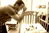 Tired father with Upset Baby Suffering with Post Natal Depression.