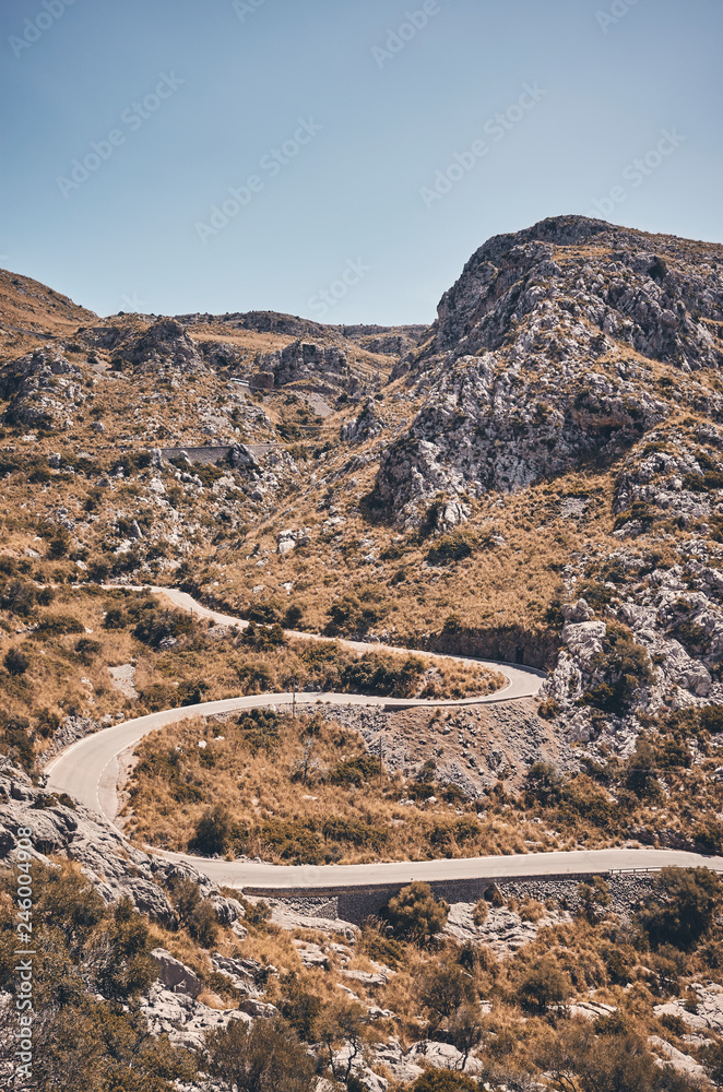 Mountain winding road, color toned picture, Mallorca, Spain.