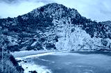 Scenic mountainous landscape with Coll Baix beach on Mallorca, Spain.