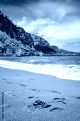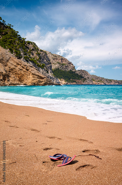 Beautiful empty beach with abandoned flip flops, summer vacation concept, Mallorca, Spain.