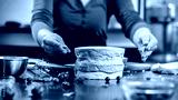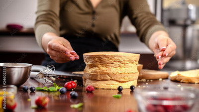 The pastry chef prepares a biscuit cake in the home kitchen or in a restaurant. The concept of the process of making cakes for restaurants, cafes and bars. on the photo the girl hands cuts a biscuit