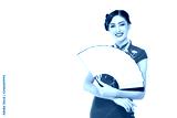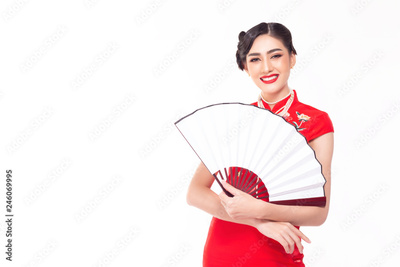 Charming beautiful Chinese woman wear chinese dress or cheongsam and pearl necklace with smiley face. Gorgeous woman hold Chinese fan that can put advertising on fan. Isolated on white, copy space